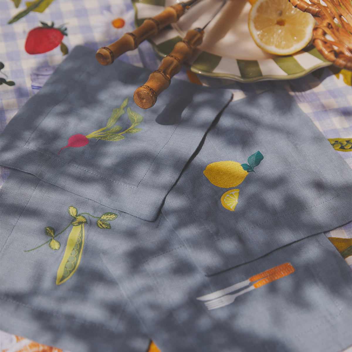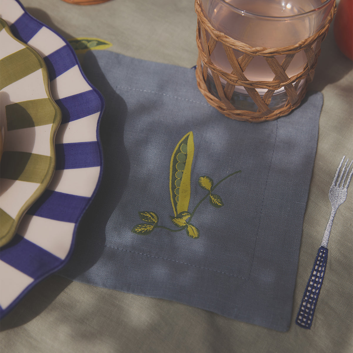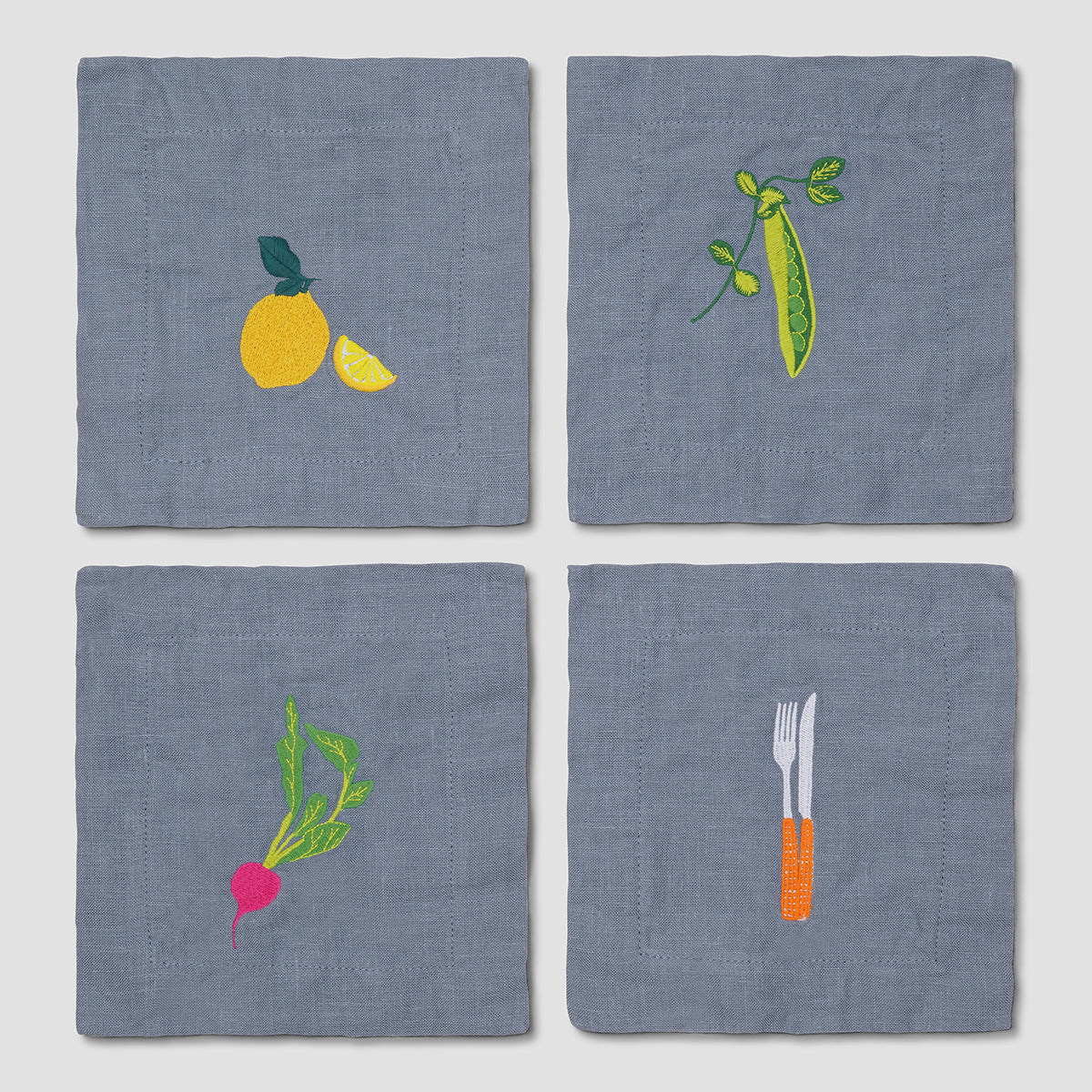 Pack up your picnic basket and head to the great outdoors with this playful collaboration with slow-fashion brand Lisa Says Gah. Featuring custom embroidery inspired by alfresco feasting, our Dusk Blue linen coasters are the perfect addition to a fun dinner table or garden drinks party.