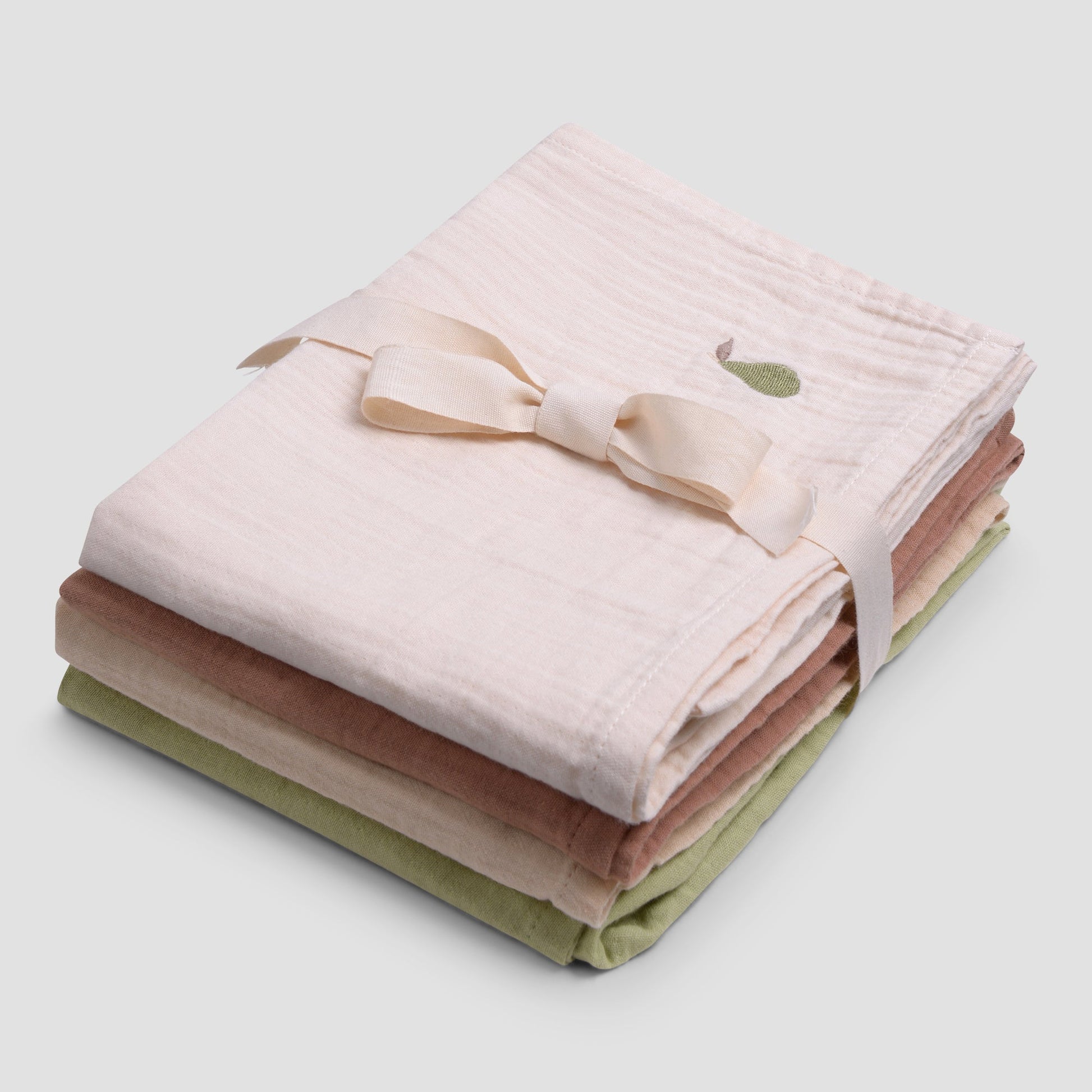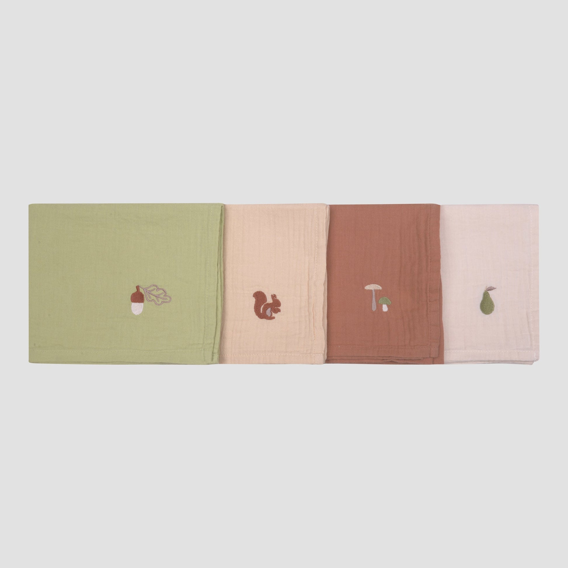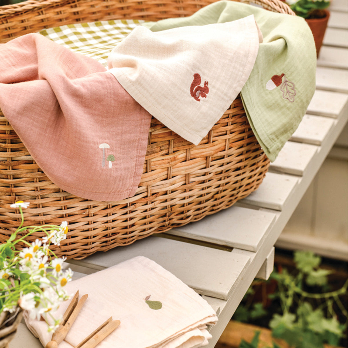 Our Cotton Gauze Muslin Squares are a nursery and nappy bag must-have. Made from 100% cotton, they’re soft, breathable and absorbent – perfect for catching drips, dribbles and spills, or as an extra blanket for warmth. Our muslin squares come in a set of four beautiful colourways (Chestnut, Chalk, Sweatpea and Buttercup), each with an embroidered woodland motif.