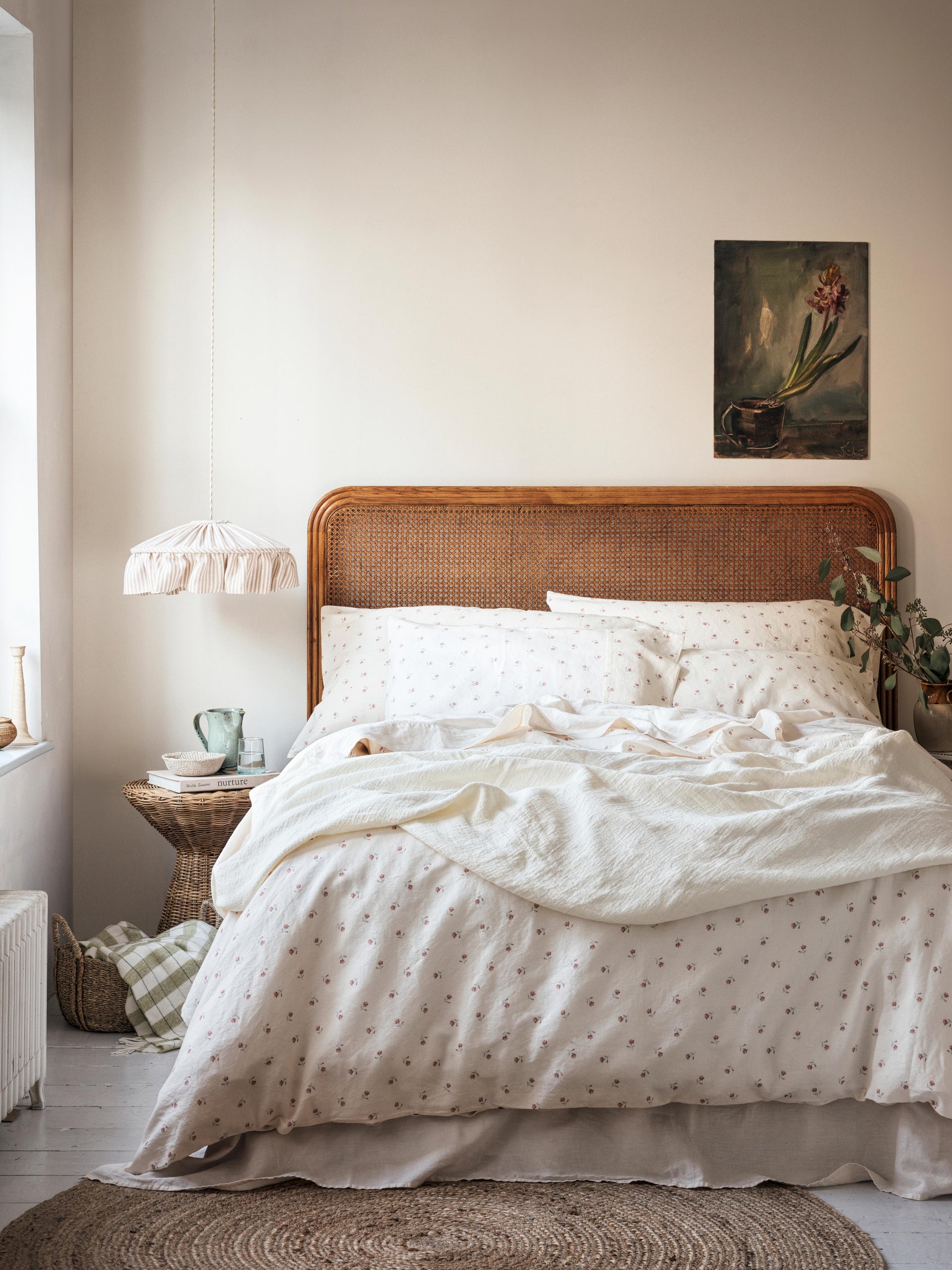 Romantic, whimsical and dotted with delicate flowers, our Posy Bud linen blend duvet cover features a reimagined vintage pattern from the Susanna Samson Design archives. Made from only the highest-quality fibres, the breathable fabric combines the effortless look of linen with the softness of cotton. Our linen blend duvet covers are finished with coconut shell button fastenings and feature handy inside corner ties to stop your duvet from slipping.
