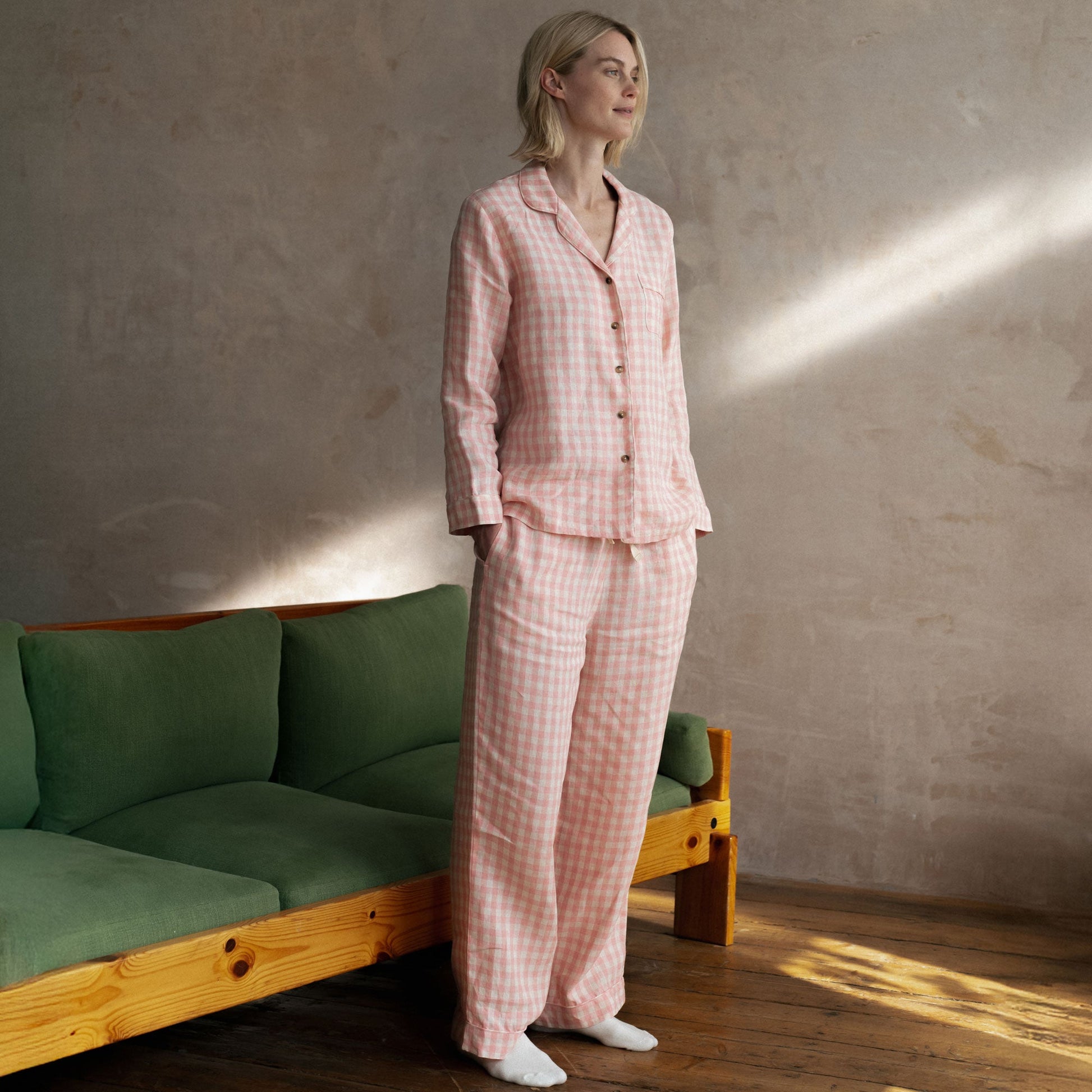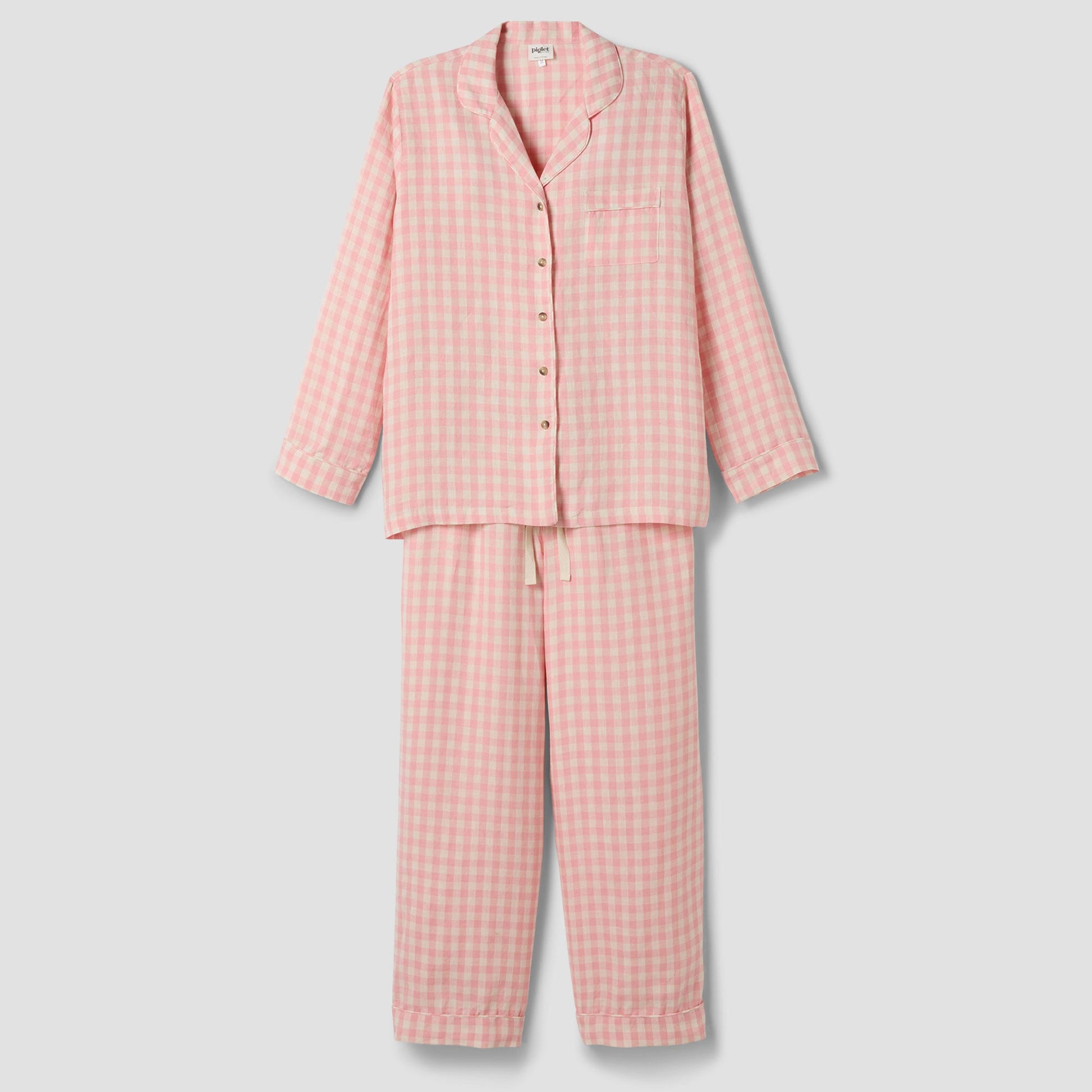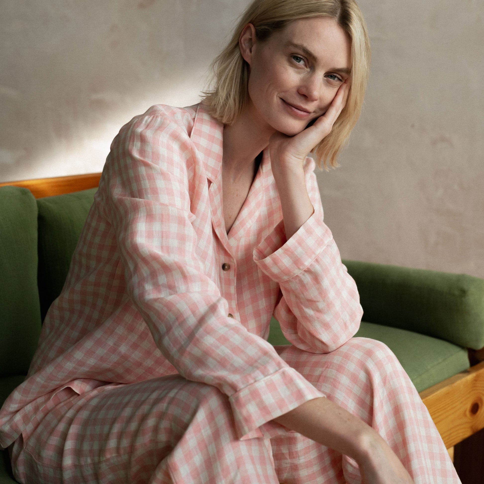 With a relaxed and comfortable fit, our Pink Bloom Gingham linen pyjama trouser set is made for quiet nights in and slow weekend mornings. Woven from 100% linen, this pyjama set is super soft and beautifully breathable, comprising a classic shirt and pair of trousers.
