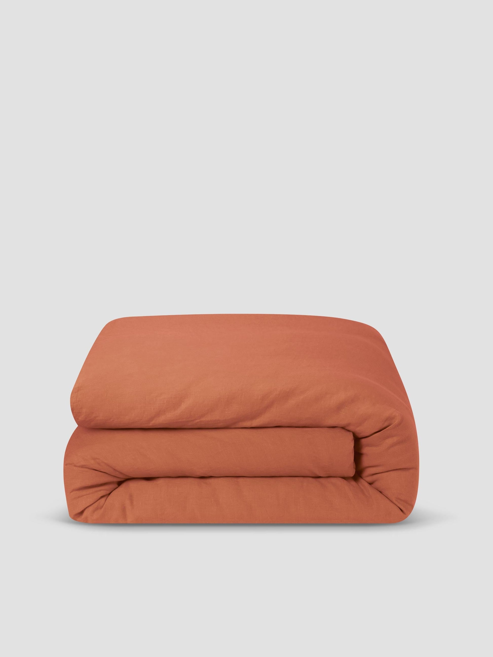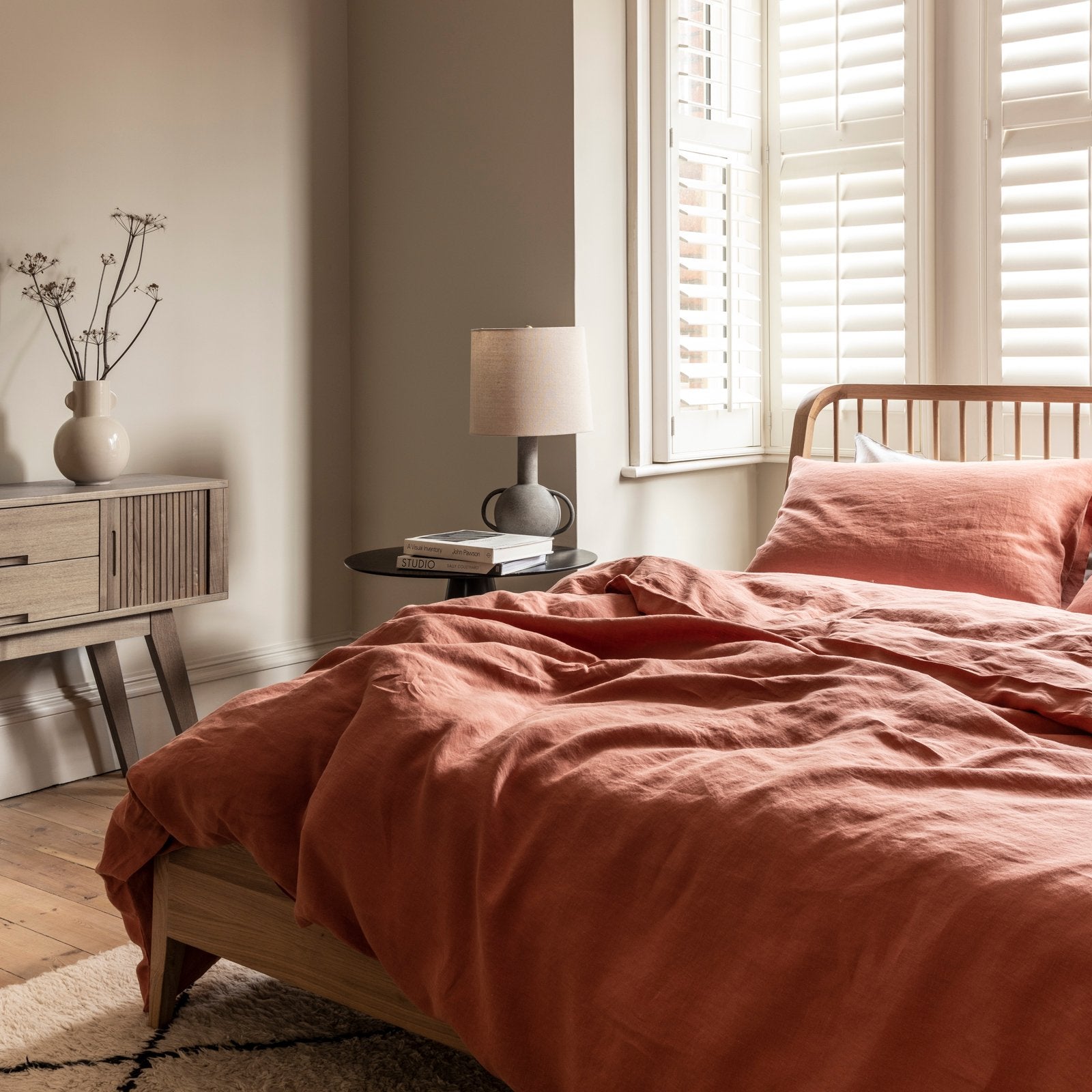 A rich and earthy shade, our Burnt Orange linen blend duvet cover is perfect for bringing a sense of cosiness and warmth to your bedroom space. Made from only the highest-quality fibres, the breathable fabric combines the effortless look of linen with the softness of cotton. Our linen blend duvet covers are finished with coconut shell button fastenings and feature handy inside corner ties to stop your duvet from slipping.