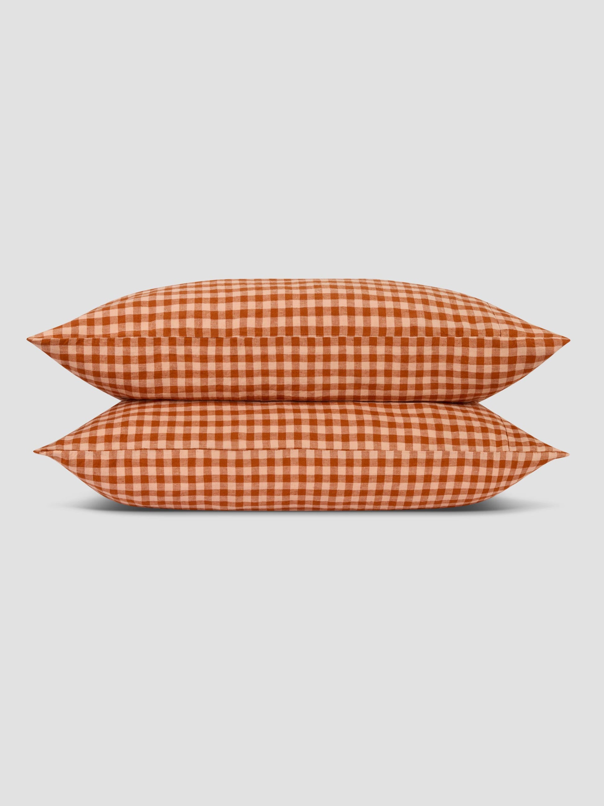 Cinnamon & Peach Colour Drenched Gingham Linen Blend Pillowcases (Pair)