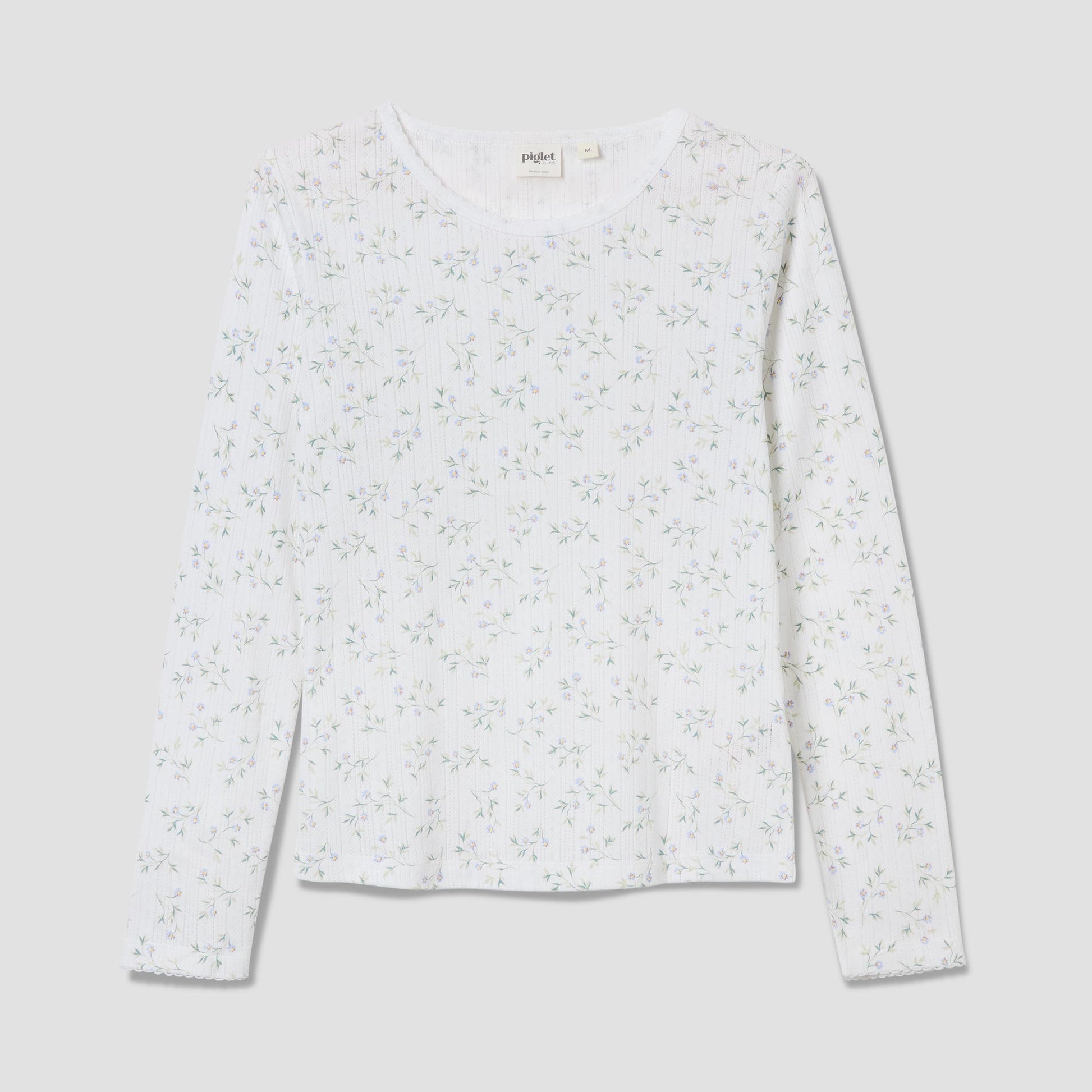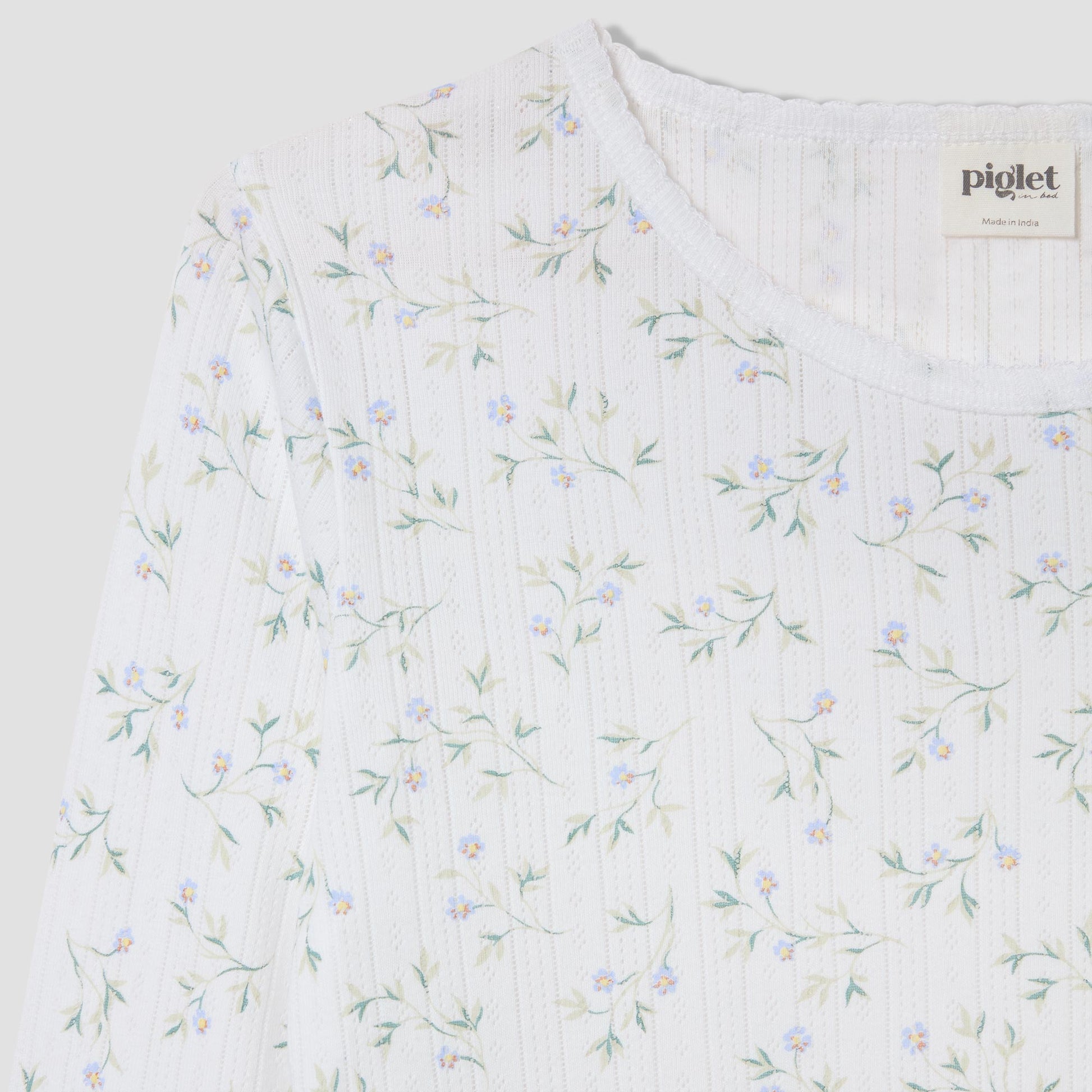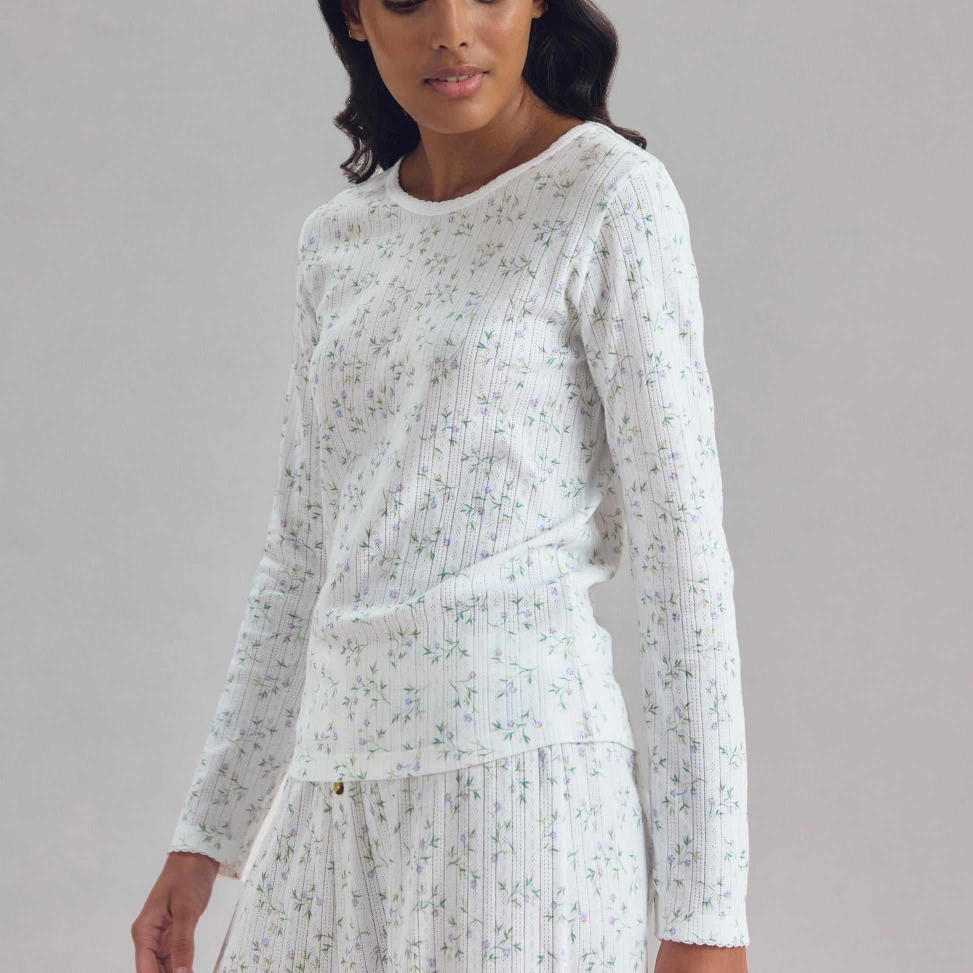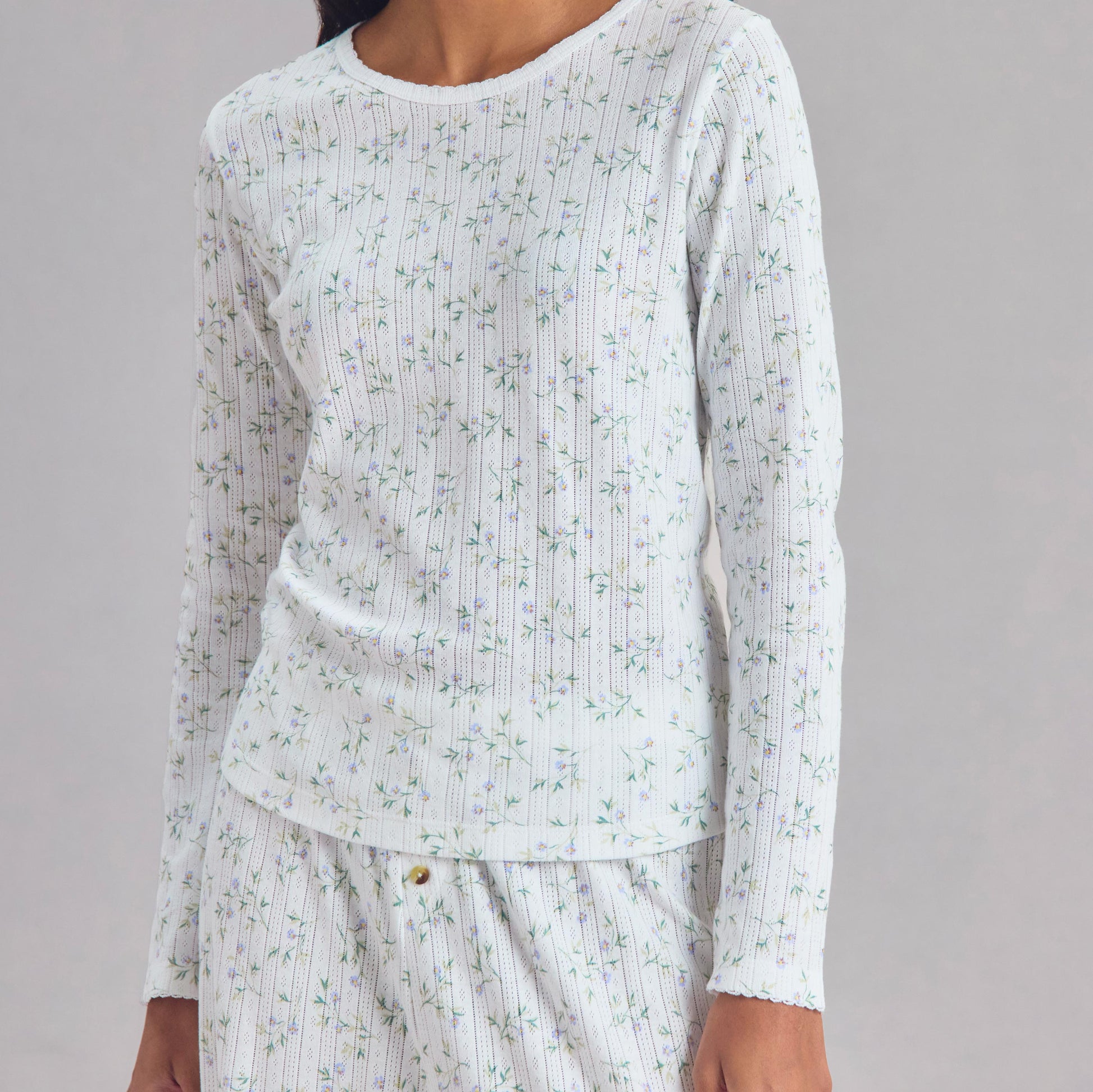 A simple, easy-to-wear layer, this long sleeve pyjama top is cut from soft organic cotton in our pointelle Spring Sprig fabric. Finished with picot trim details, it pairs perfectly with any of the coordinating separates.
