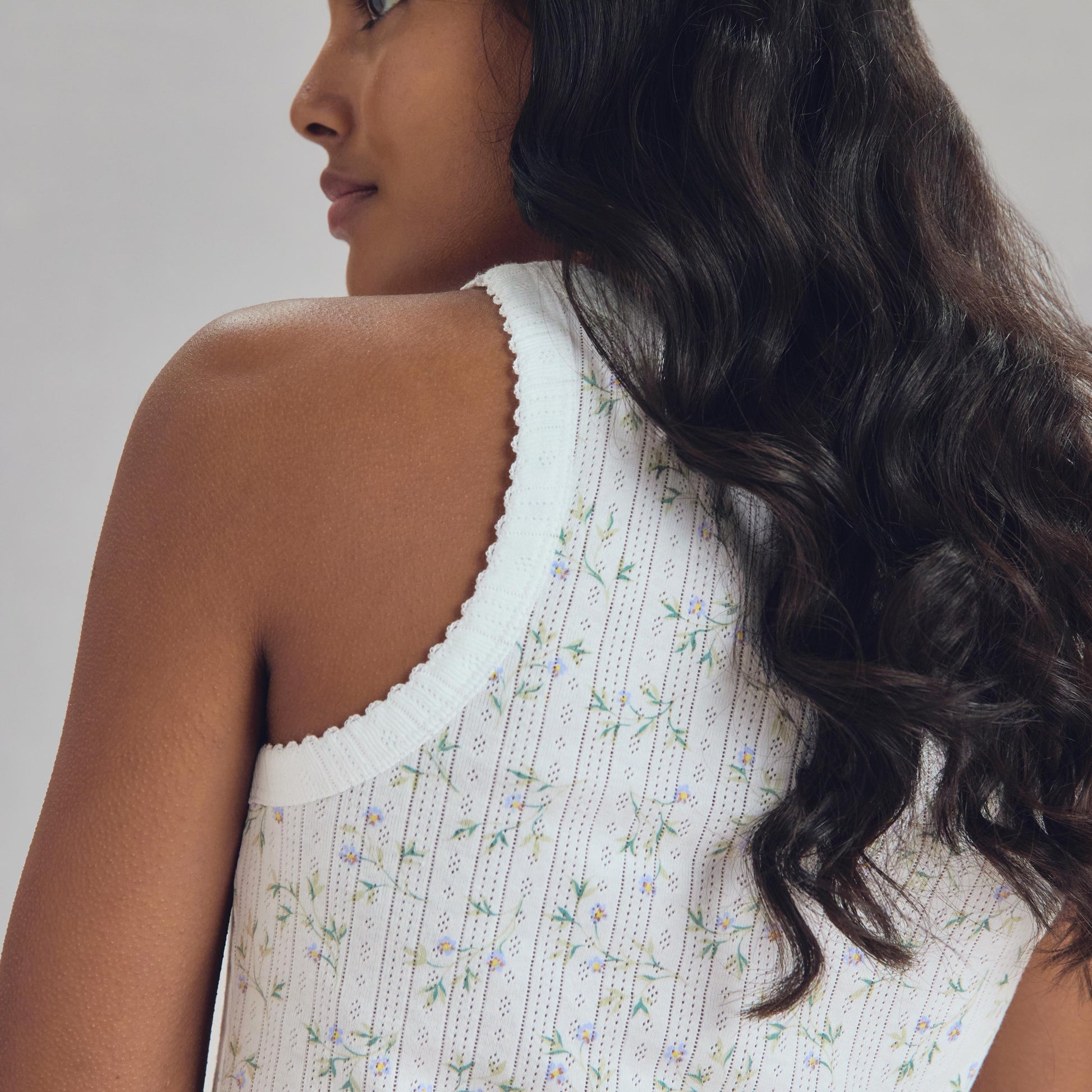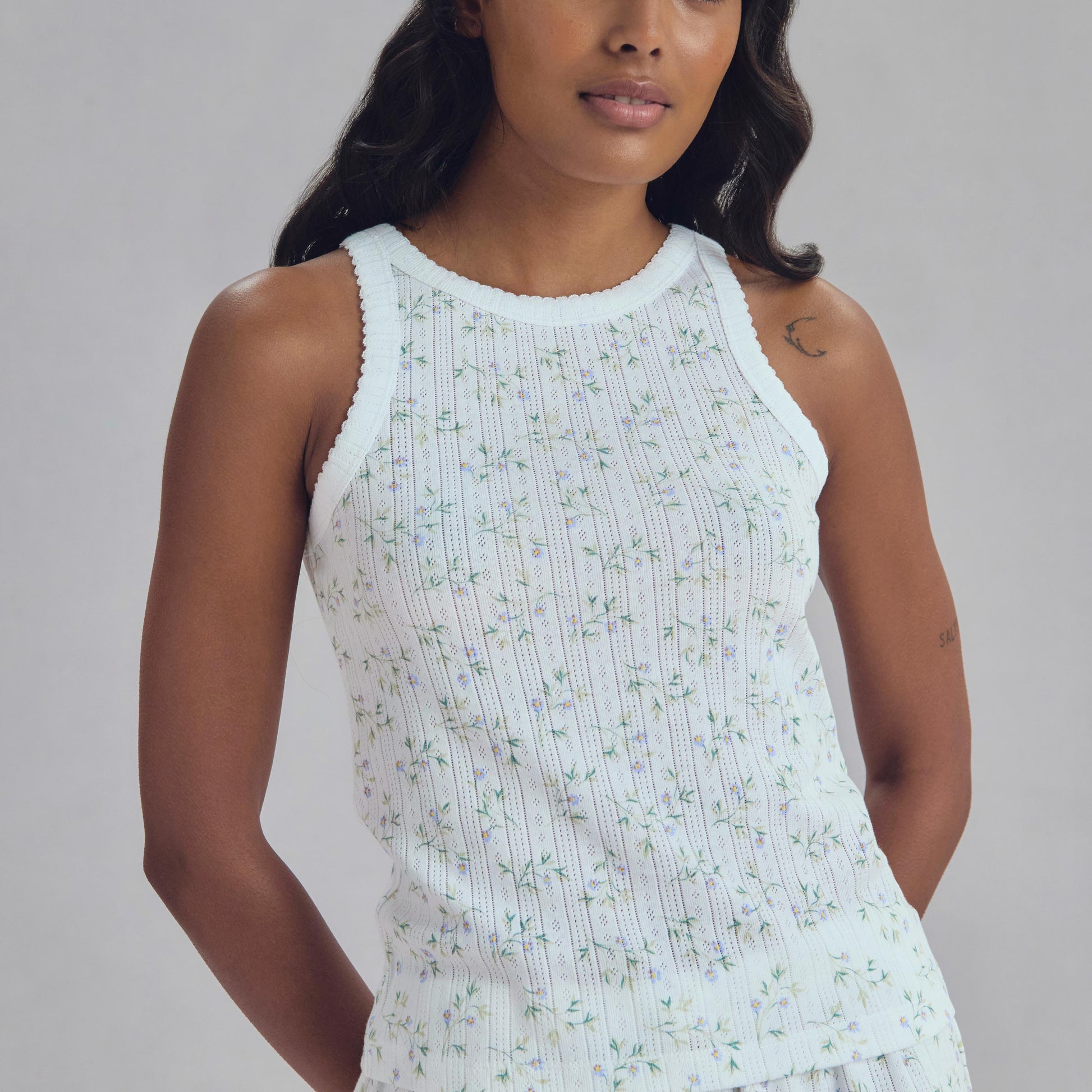 The Spring Sprig pyjama vest is a simple racerback style, made from lightweight organic cotton with a textured pointelle knit and soft floral Spring Sprig print. An easy mix-and-match piece, it’s perfect for layering or warm nights.